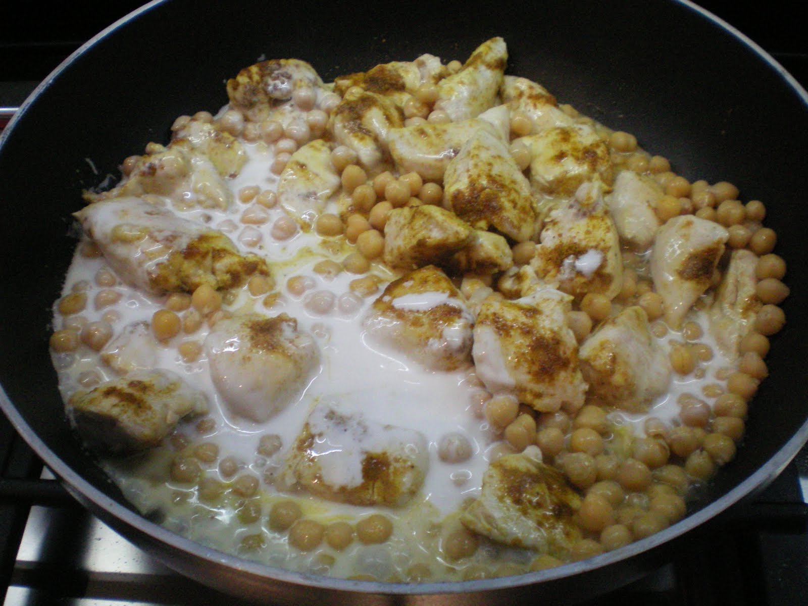 Scolare i ceci, lavarli e aggiungerli al pollo, lasciar rosolare e infine aggiungere il latte di cocco.